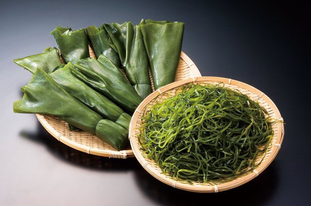 岩手県の主要産地である宮古・普代エリアでは、コンブの最高級品と呼ばれる真昆布の養殖が行われています。肉厚で幅が広く、だしのほか、湯通し塩蔵コンブ、すきコンブなど「食べるコンブ」として需要が高まっています。低カロリーのアルカリ性食品としても注目されています。